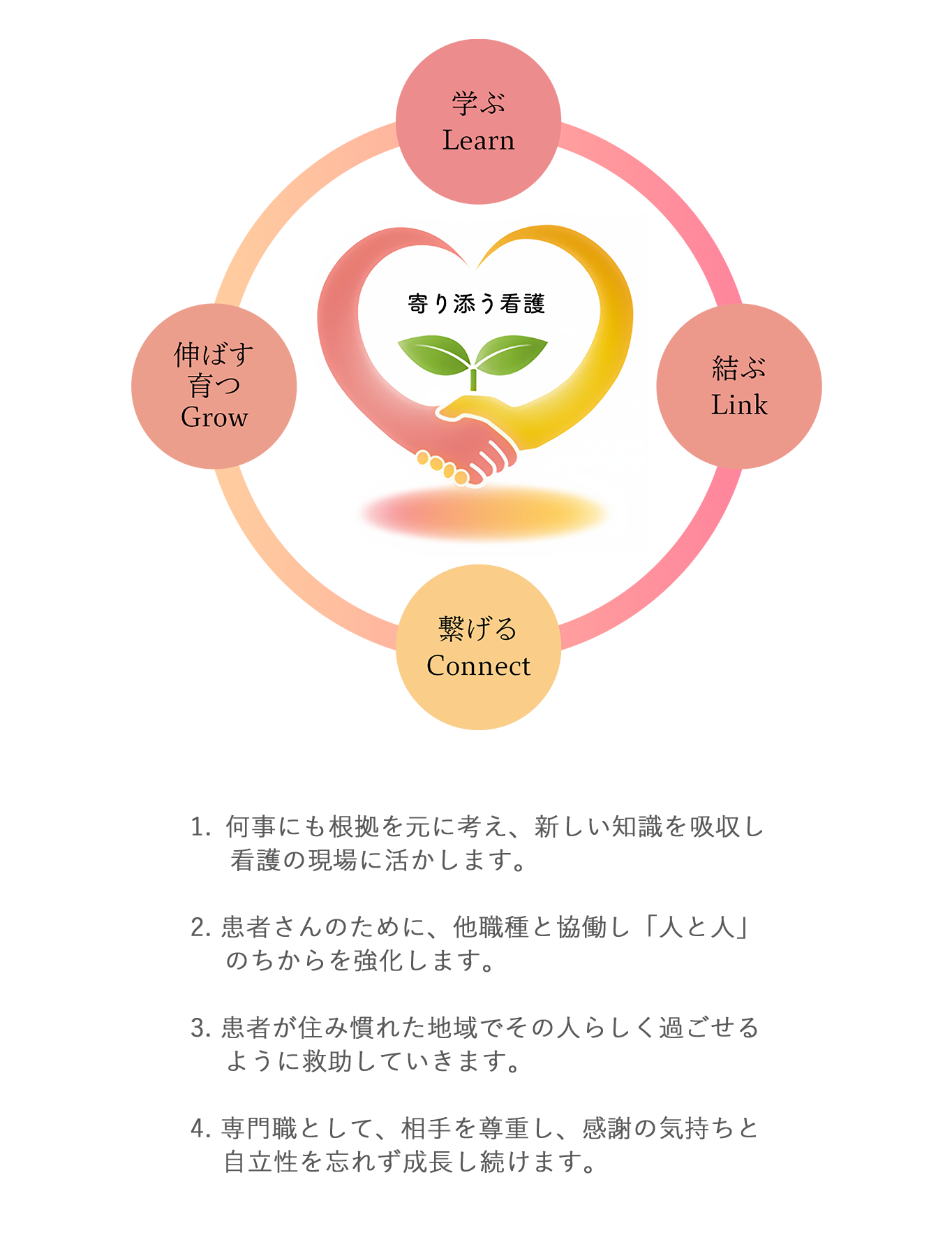 しかし、看護を通して専門職業人として、そして人間として成長していくことが出来ると信じています。また、看護をつないでいくのは私たちの「手」です。